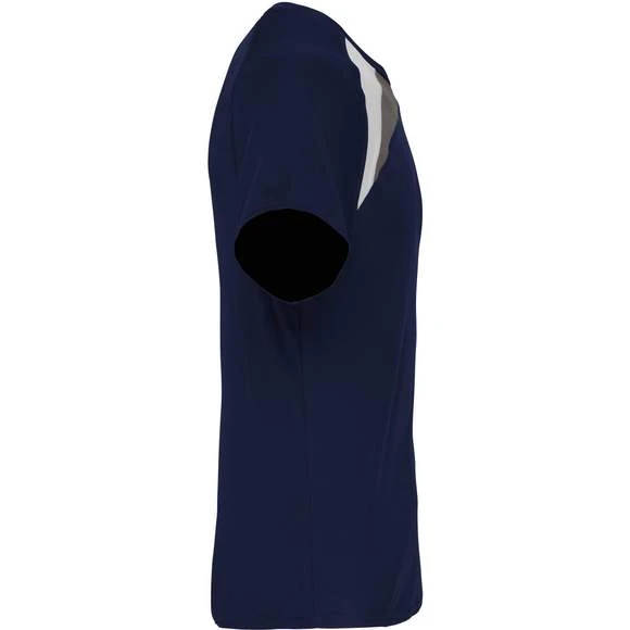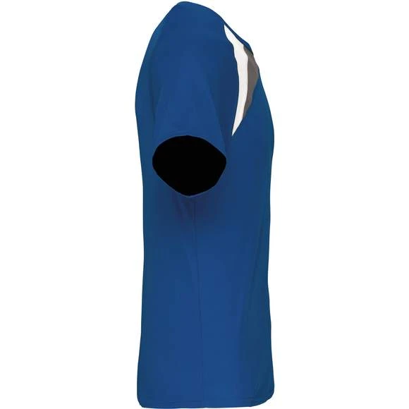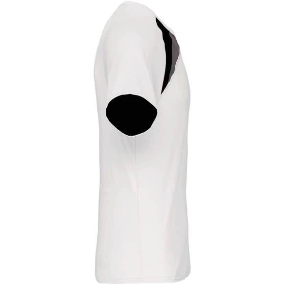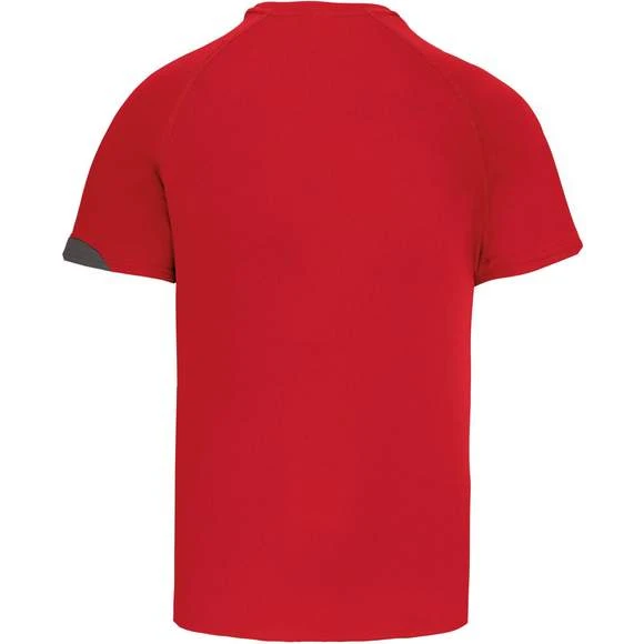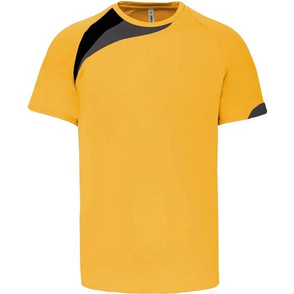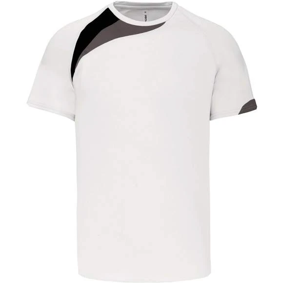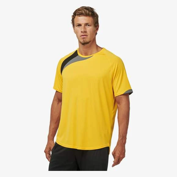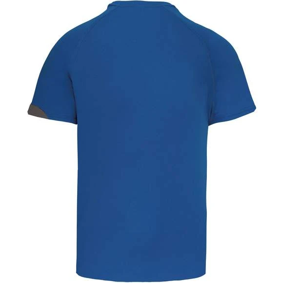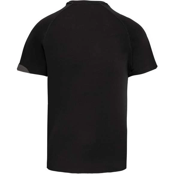 100% polyester. Tissu à séchage rapide. Empiècements contrastés. Finition points de recouvrement ton sur ton. Finition double aiguille au bas de vêtement et manches. Grammage : 140g/m²