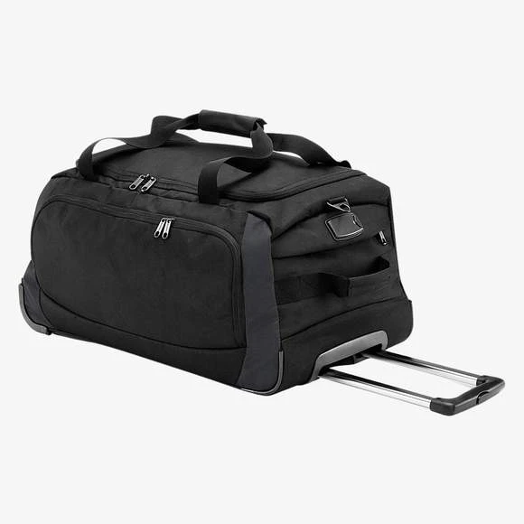 1680 D Polyester, poignée extractible pour tirer le sac, bandoulière ajustable et détachable, roulettes résistantes, diverses poches internes dont une avec fermeture à glissière, convient pour la broderie; capacité: 65 litres. Dimensions: 65 x 36 x 33 cm, surface d’impression: 40 x 14 cm. Grammage : 1680g/m²