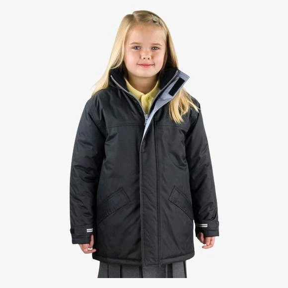– extér: 100% StormDri enduit PU revêtement Polyester Pongee – couche interm: Quilted 160g/m2 rembourrage Polyester – doublure: 160g/m2 matelassage polyester – capuche 3 sections dans le col avec ajusteur latéral – fermeture à glissière complète avant 7mm – 2 poches avant invisibles sous rabat tempête avec doublure polaire très chaude – étiquette nom et classe dans la poche à gauche – doublure polaire dans les poches pour garder les mains au chaud – bande réfléchissante de sécurité à travers le dos plus l