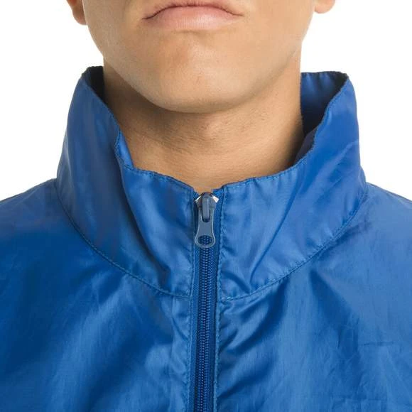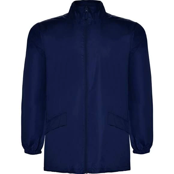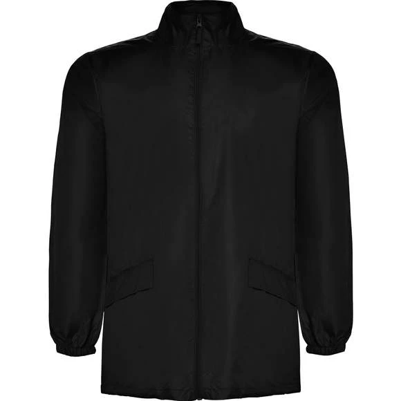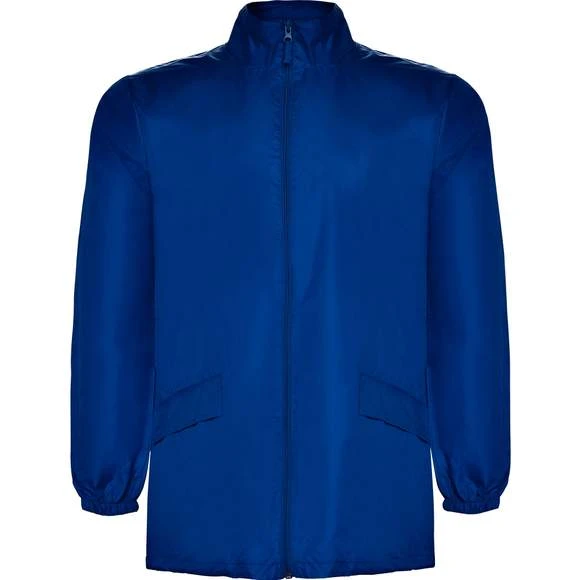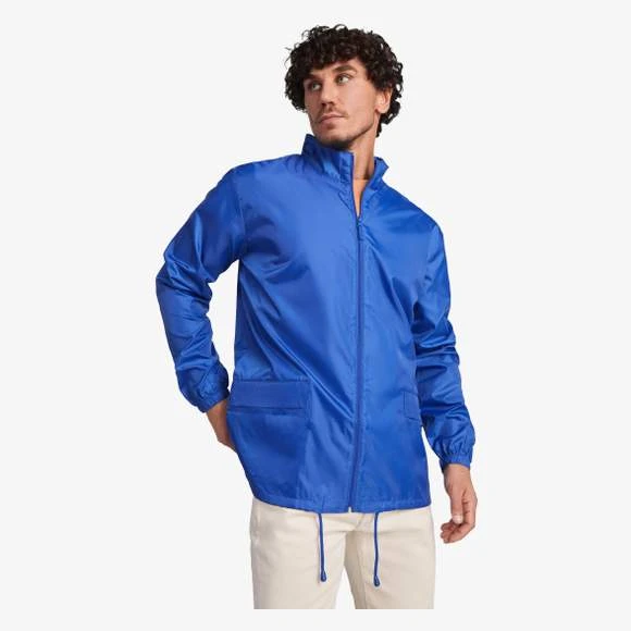 Veste col montant avec fermeture éclair ton sur ton sur toute la longueur et poignets élastiques. Cordon de serrage élastique avec stoppers. Capuche doublée dans le col et 2 poches avec rabat et fermeture par bande auto-agrippante. 100% polyester Taffeta.