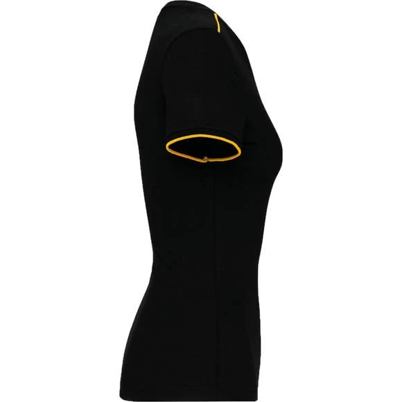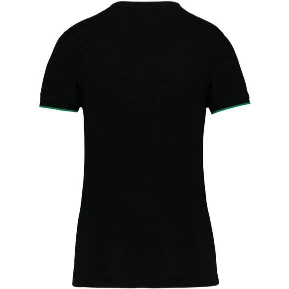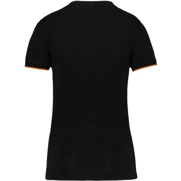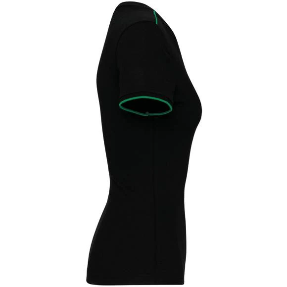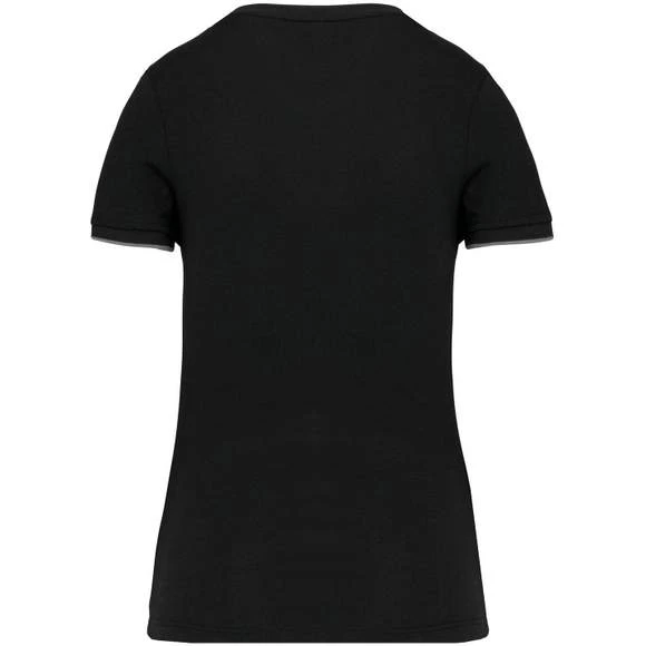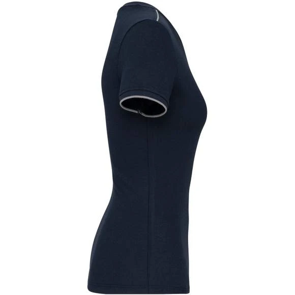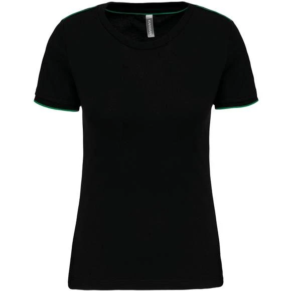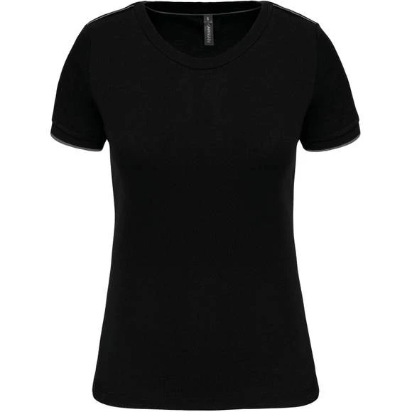 T-shirt à manches courtes pour femme. Encolure ronde avec élasthanne. Passepoil contrasté intérieur col et épaules. Finition bas de manches en bord-côte avec liseré contrasté. Finition double aiguille au bas de vêtement. Idéal pour une utilisation quotidienne. Composition : 65% polyester, 35% coton peigné tissu jersey. Traitement antiboulochage. Grammage : 190g/m²